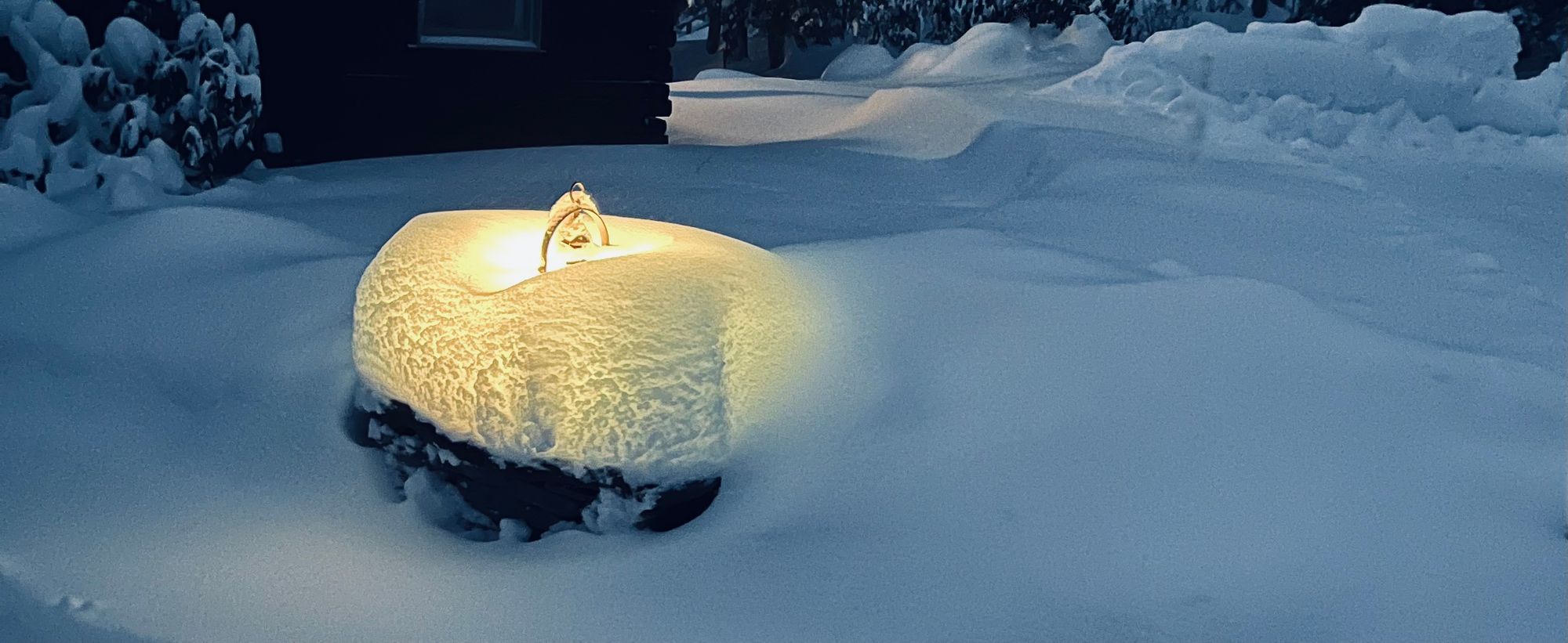 We have gone through more wood than usual by this time of year, heating the cabin through four separate power outages. The last one was a week ago, a shorter downtime of twenty-four hours compared to the two and three-day interruptions that came before, beginning around Christmas. The problem has been the heaviness of the snow. Very wet, large flakes accumulate on the branches, weighing them down, eventually causing many to break. The scene it creates, however, is magical. For a few days, we occupied the world of Zhivago. We lived in a snow palace decorated to the top in white. It could have been Narnia. A faun might have come trotting down the driveway under the canopy. I can share a picture of our lamppost, looking as if it were buried in meringue.